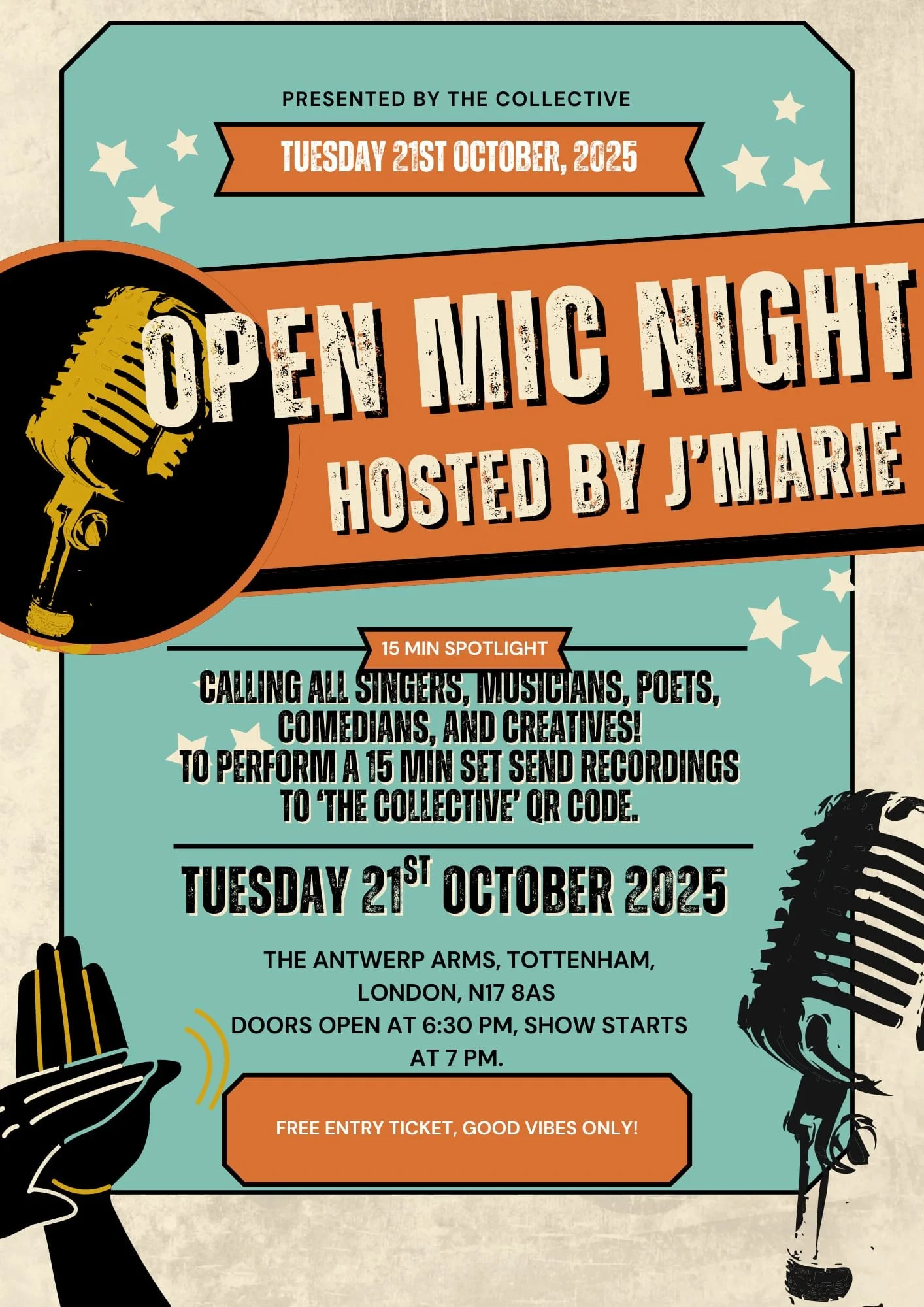 J'Marie is a North London singer and community builder passionate about creating spaces where creativity and connection meet. After leading community music nights and youth praise nights, taking a break from performing, she’s now returning to the stage to honour her late mum’s love for music and laughter. She hosts The Collective, a monthly open mic night at The Antwerp Arms, bringing together singers, poets, comedians, and musicians from all walks of life. Whether you’re a first-timer or a seasoned performer, J'Marie invites you to bring your backing track, step up, share your voice and be part of a growing creative family every 3rd Tuesday of the month.