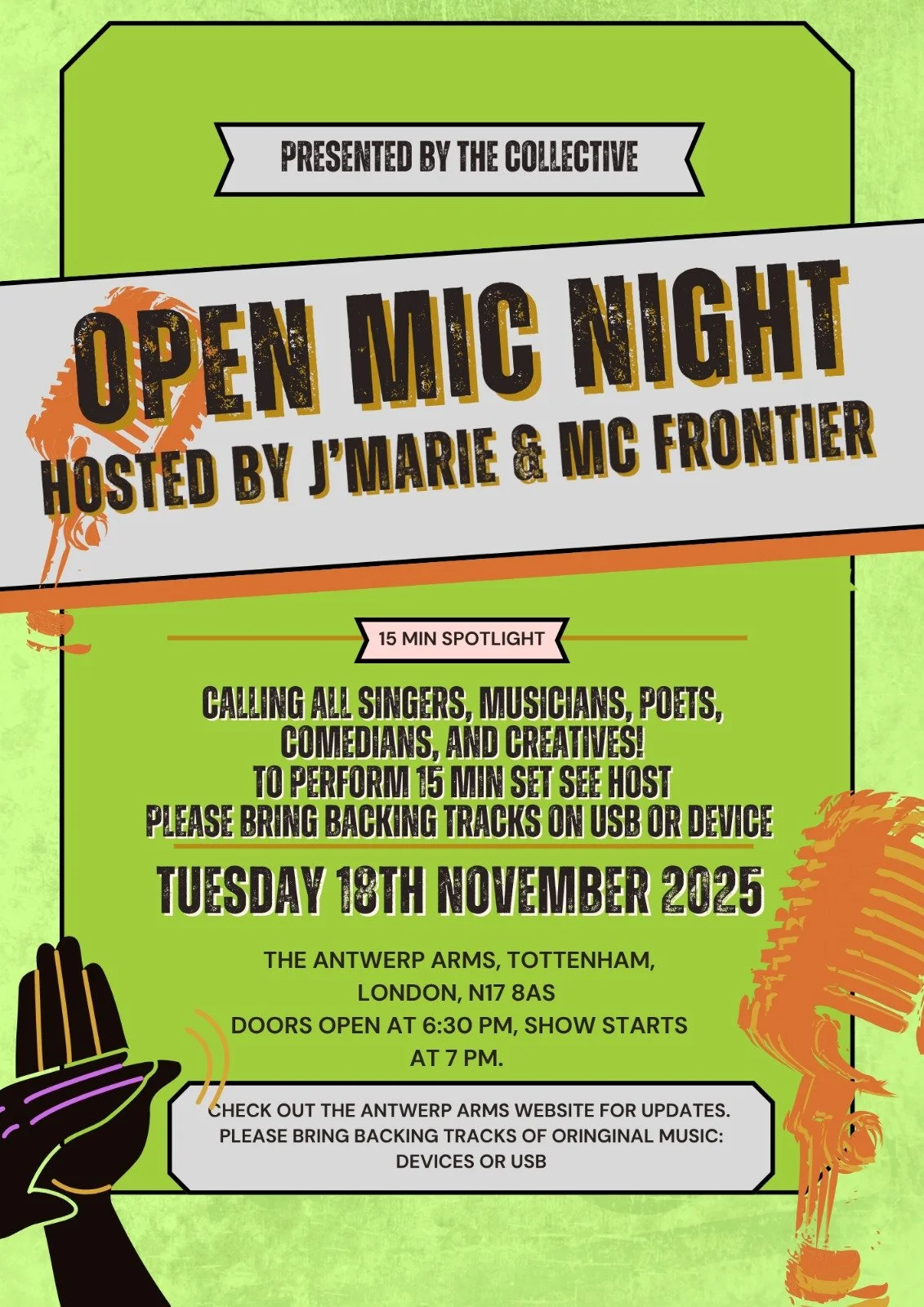 J'Marie is a North London singer and community builder passionate about creating spaces where creativity and connection meet. After leading community music nights and youth praise nights, taking a break from performing, she’s now returning to the stage to honour her late mum’s love for music and laughter. She hosts The Collective, a monthly open mic night at The Antwerp Arms, bringing together singers, poets, comedians, and musicians from all walks of life. Whether you’re a first-timer or a seasoned performer, J'Marie invites you to bring your backing track, step up, share your voice and be part of a growing creative family every 3rd Tuesday of the month.